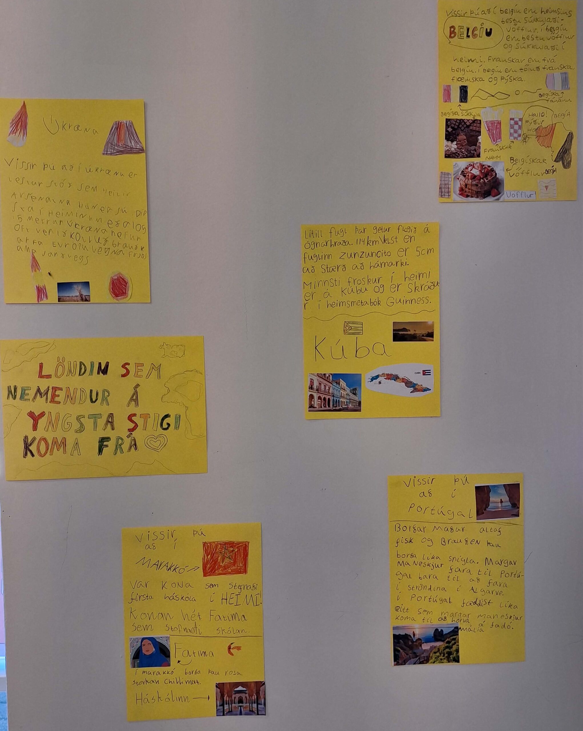Í vikunni voru skemmtilegir þemadagar þar sem unnið var með fjölmenningu á ýmsan hátt. Yngstu börnin léku sér m.a. með tungumál, skrifuðu setningar og tölur á tungumálum nemenda skólans, lærðu um mismunandi lönd, fána, dansa, tónlist og fleira tengt ólíkum menningarheimum. Eldri nemendur völdu sér viðfangsefni sem m.a. tengdust mat og menningu, fatnaði, íþróttum, tónlist og dansi, og byggingum. Þemadögunum lauk með kynningu hjá nemendum í 5. – 10. bekk þar sem þeir kynntu afrakstur af vinnu sinni og buðu margir nemendur upp á mat sem var einkennandi fyrir landið sem þeir voru að kynna.